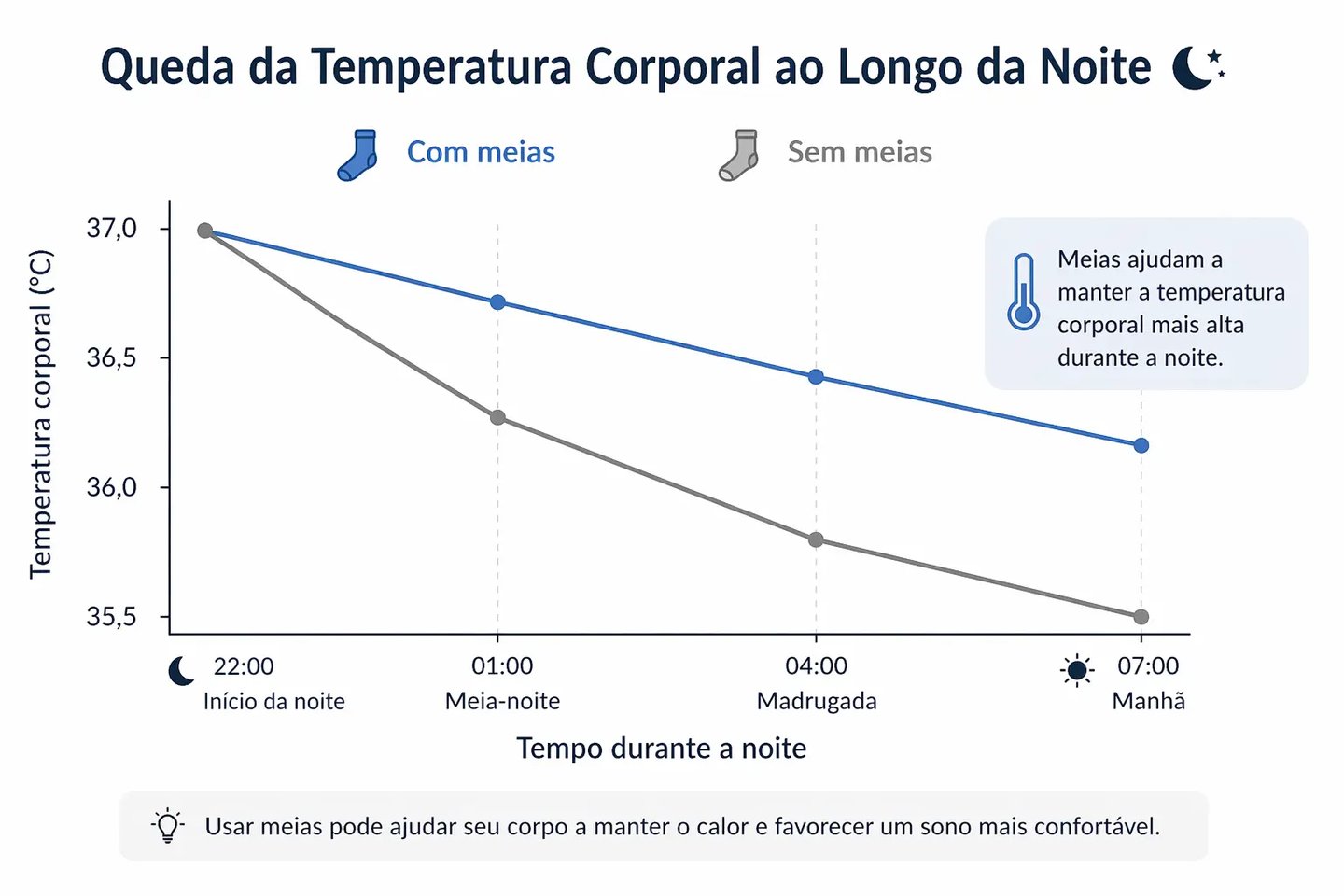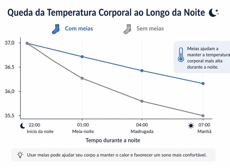 Usar meias aquece os pés, o que acelera a vasodilatação nessa região. Com mais calor nos pés, o corpo dissipa temperatura central com mais eficiência, e o núcleo esfria mais rápido.